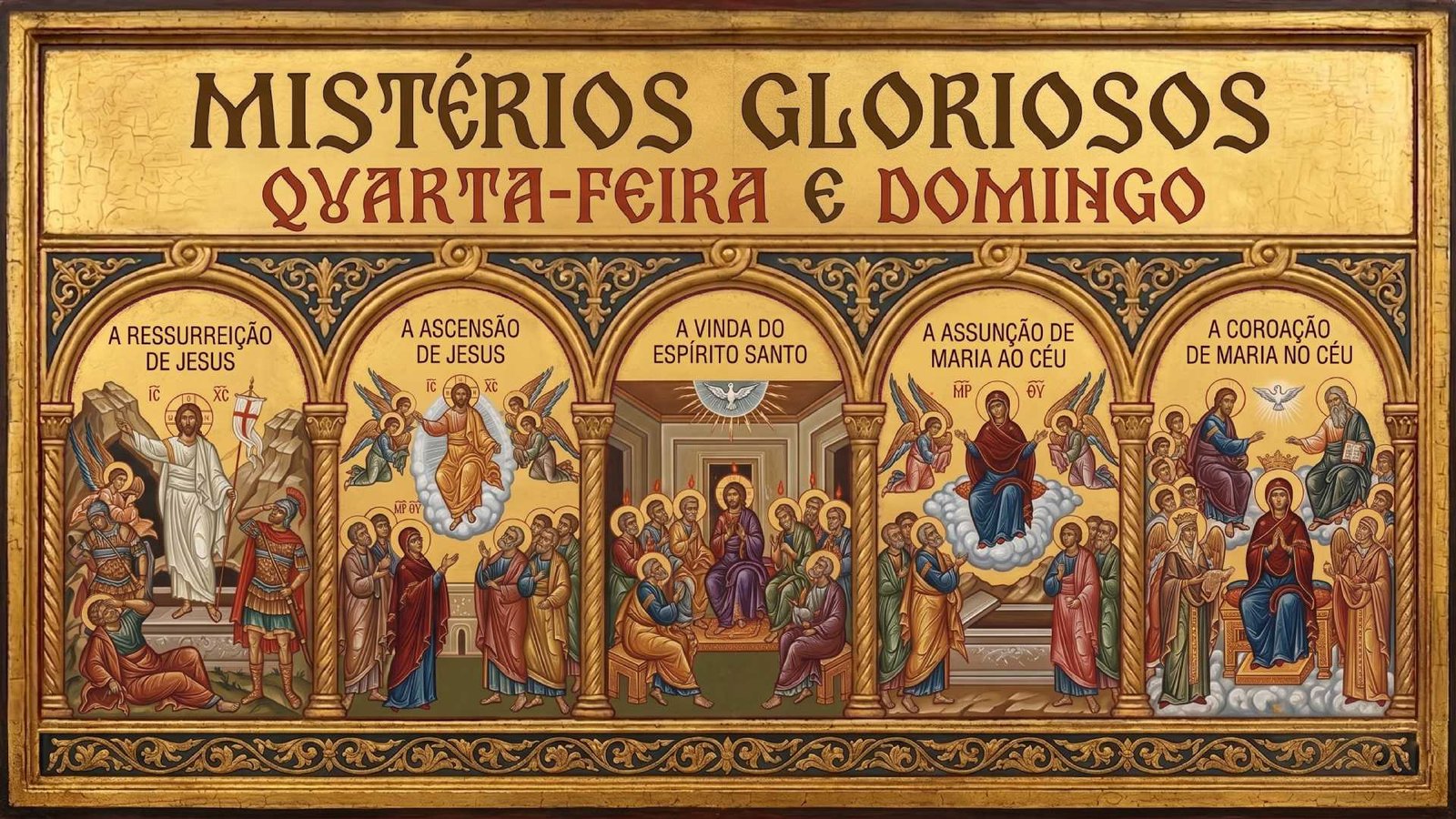 Às quartas-feiras e domingos, a Igreja Católica medita os Mistérios Gloriosos. Eles contemplam a vitória de Cristo e a glória do Céu, passando pela Ressurreição de Jesus, Sua Ascensão ao Céu, a Vinda do Espírito Santo (Pentecostes), a Assunção de Nossa Senhora e a Sua Coroação como Rainha do Céu e da Terra.
