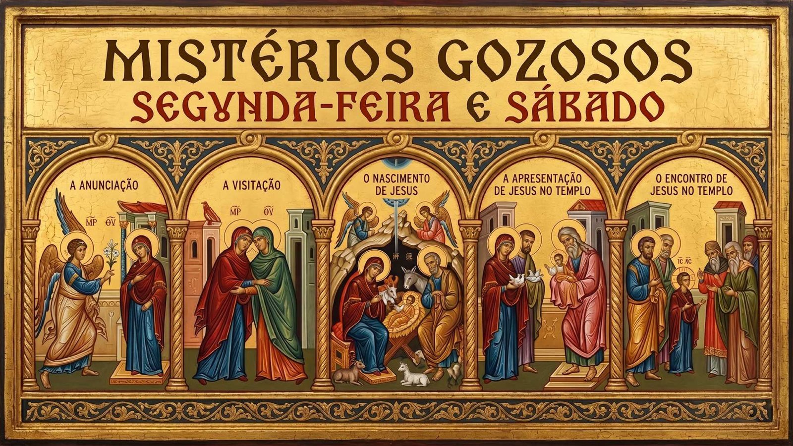 Às segundas e sábados, a Igreja Católica medita os Mistérios Gozosos. Estes mistérios contemplam a infância de Jesus Cristo e a alegria da Sua encarnação, passando pela Anunciação, a Visitação de Maria, o Nascimento em Belém, a Apresentação no Templo e o Reencontro de Jesus entre os Doutores da Lei.